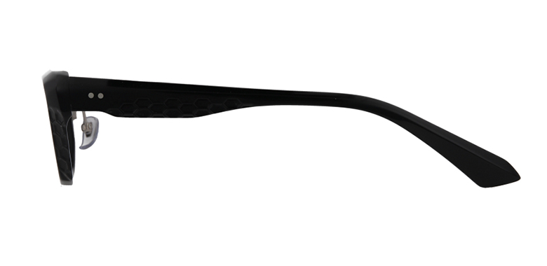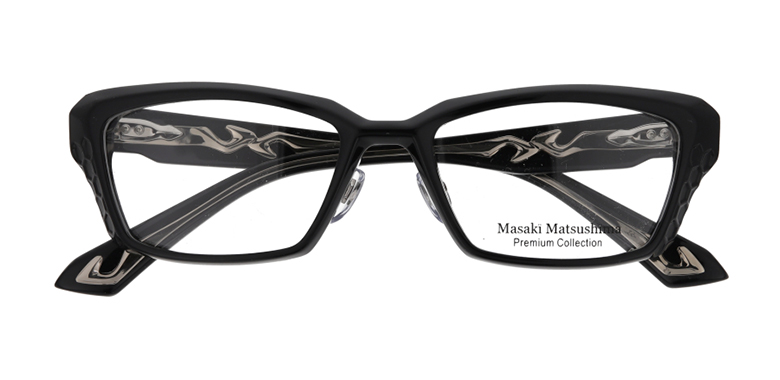エッジを効かせたスクエアシェイプで全体に面カットを入れ、また、フロントサイドとテンプルにプレスによるハニカム模様を施し、独自性のあるアクセントとしています。丁番は5枚コマでカシメ丁番としており、マサキ・マツシマのイメージでもあるフック状のモチーフの飾り芯材を芯張りにて採用し、さりげなくアピールしています。また、ブランドの25周年アニバーサリーの一環で、左テンプルの内側にシリアルNoを入れています。